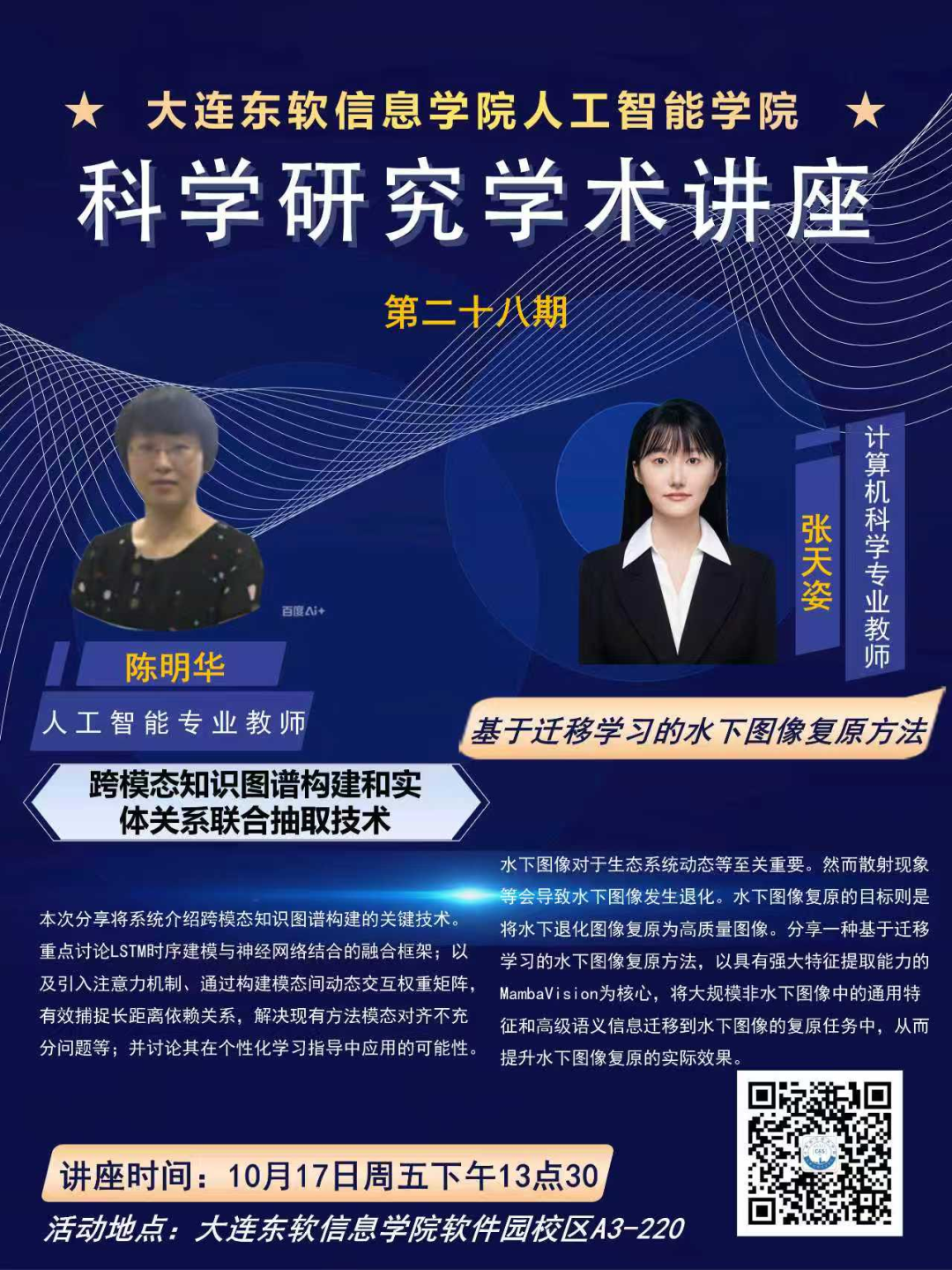 大连东软信息学院人工智能学院第二十八期科学研究学术讲座来啦,人工智能学院两位专业教师陈明华、张天姿将带带来精彩分享,内容涉及跨模态知识图谱构建和实体关系联合抽取技术、基于迁移学习的水下图像复原方法,为你打开学术研究的新视角。欢迎大家积极参与,探寻科研的奥秘!