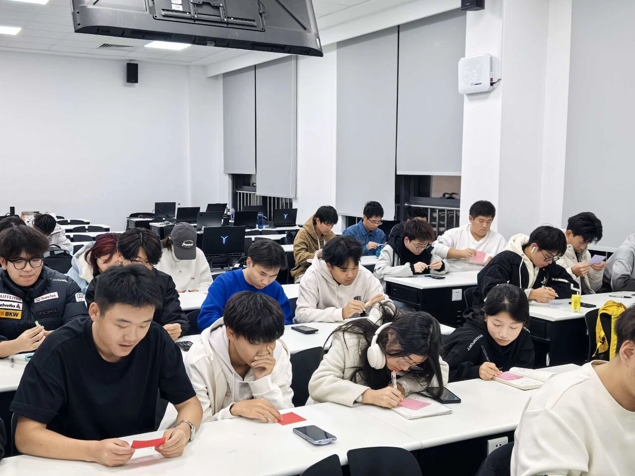 班会伊始,2025级素质教师结合历届学生四年成长的经历,鼓励同学们围绕“解锁新技能”、“结交真心挚友”、“勇敢尝试不遗憾”三大方向书写期许。同学们低头沉思后,笔尖在卡片上不停舞动:有人写下“学会吉他弹唱,加入音乐社团”,有人期许“通过英语四级,结识3位志同道合的朋友”,也有人立志“突破社恐,主动参加2次志愿活动”,每一笔都饱含对未来一年的憧憬。