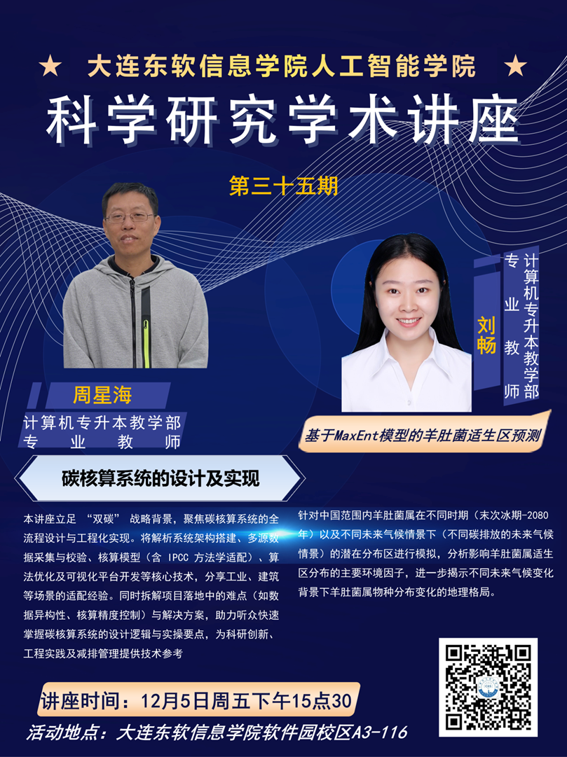 第三十五期是由计算机专升本教学部两位资深专业教师周星海、刘畅将带来前沿学术分享,内容围绕碳核算系统的设计及实现和基于MaxEnt模型的羊肚菌适生区预测展开,带您穿透人工智能与产业融合的核心场景,探寻技术落地与科研前沿创新的并行之路。
