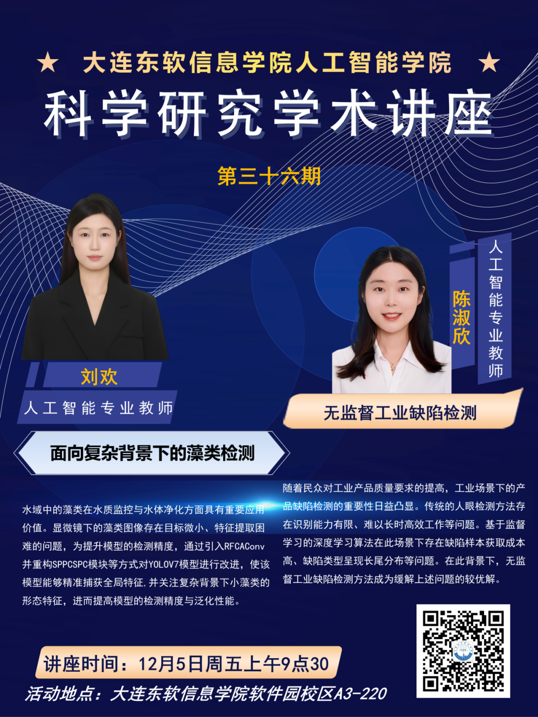 第三十六期紧随其后,由人工智能专业两位资深教师刘欢、陈淑欣主讲,内容围绕面向复杂背景下的藻体检测以及无监督工业缺陷检测展开。带您深入了解工智能与产业融合的核心场景,探寻技术落地与科研前沿创新的并行之路。