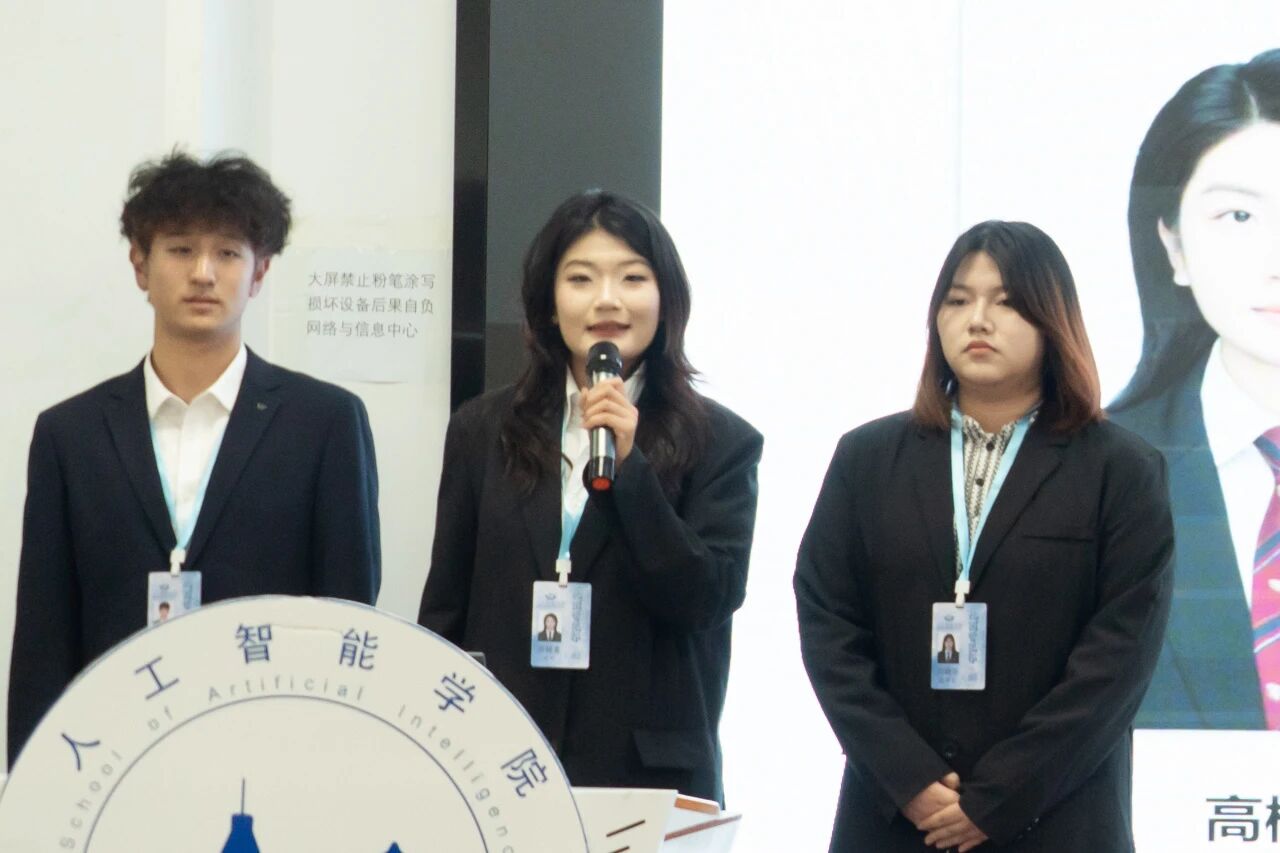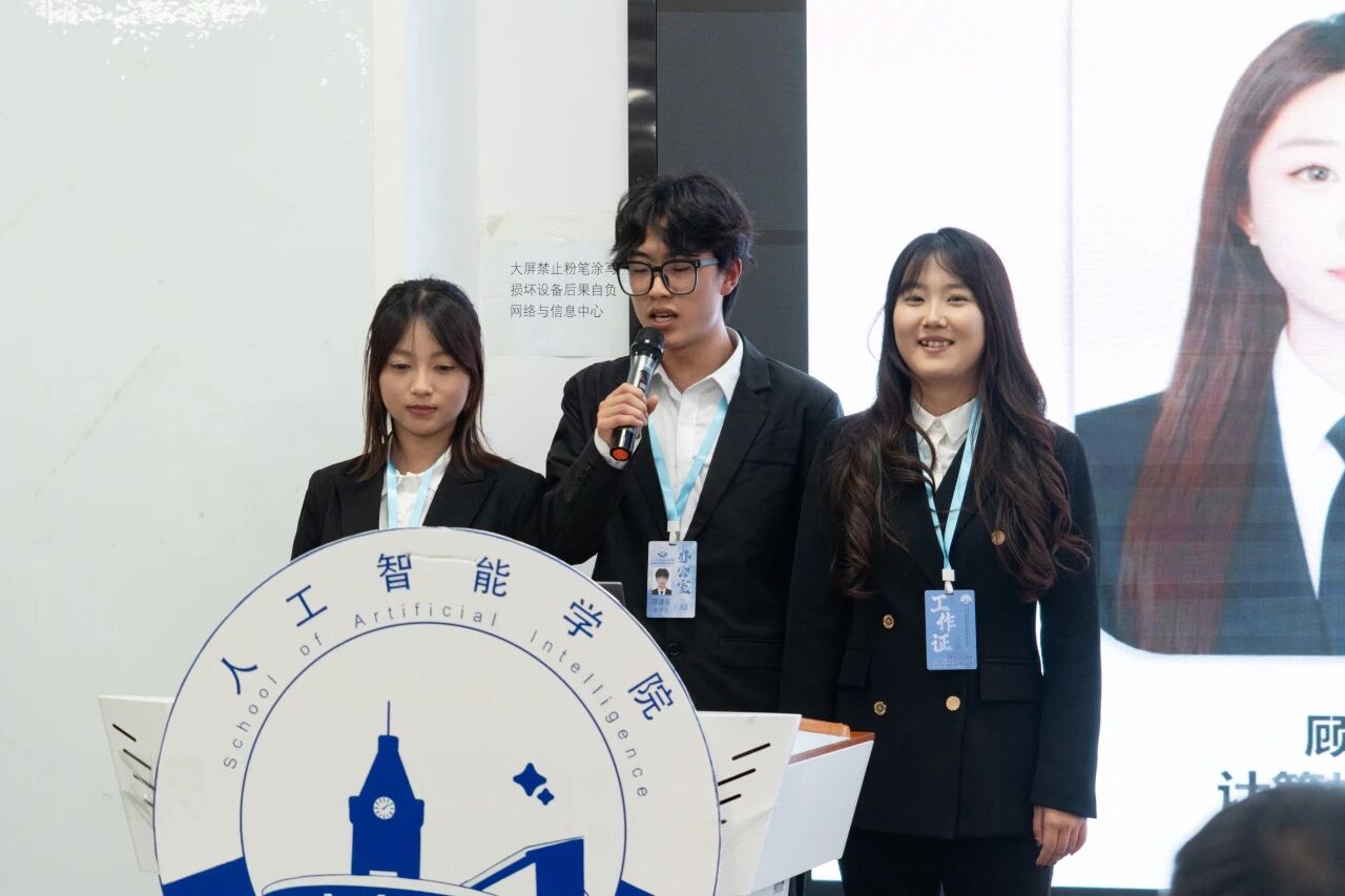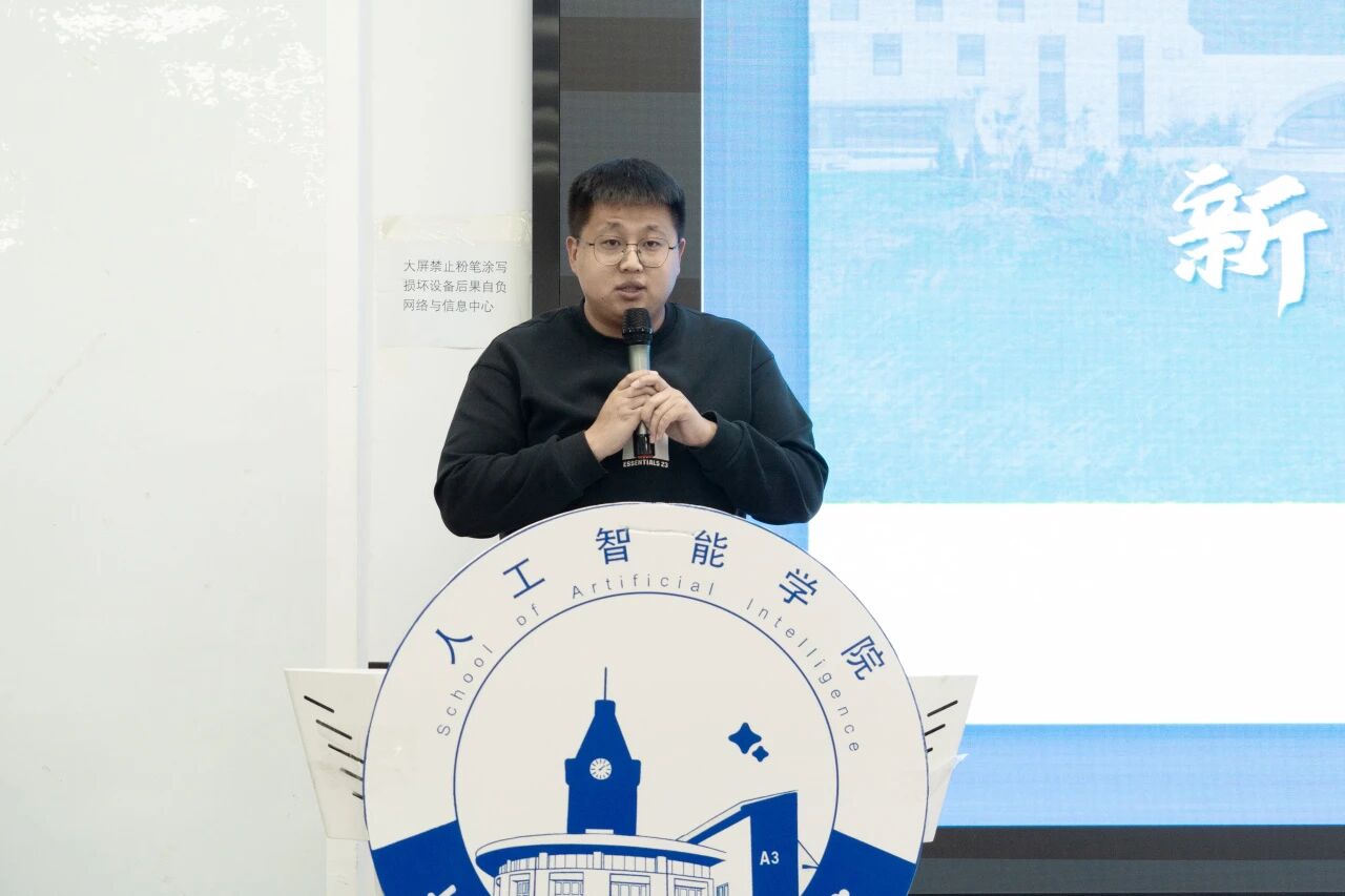 人工智能学院团委学生会上届主席团成员刘宇飞在发言中,首先代表上一届主席团,向始终给予信任与支持的老师、并肩奋斗的学生会同仁,以及给予理解与鼓励的全体同学致以诚挚感谢。他结合自身经历,对下一届学弟学妹们恳切寄语:希望大家秉持“既来之,则安之”的心态,不必畏惧前行中的失败——这段旅程里,最大的收获不仅是能托付后背的挚友,更是在直面并解决问题时,逐渐锤炼出的脚踏实地的韧性。他以“是金子总会发光”激励新一届团委学生会成员,鼓励大家更大胆突破、更富创意,始终贴近同学需求与校园实际,勇于挑战现有工作模式、探索新路径。他还引用博尔赫斯“友谊一旦建立,它便一无所求”的名言,感慨这段经历中沉淀的赤诚之心、协作精神与责任担当,终将成为每个人未来行囊中最宝贵的财富。最后,他送上双重祝福:愿每一位成员都能成长为自己心中期待的模样,也期盼团委学生会在新一届团队的带领下薪火相传、续写新篇,共同助力人工智能学院的未来越来越好。