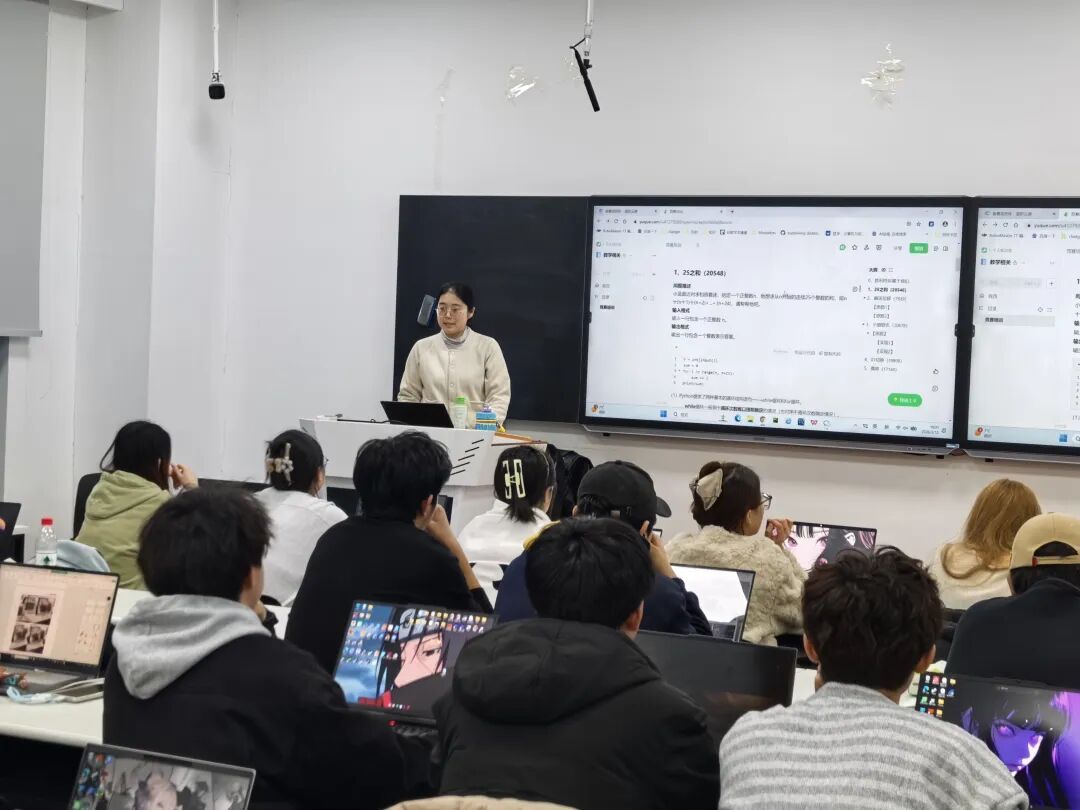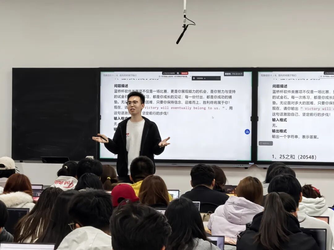 竞赛专题辅导课由专任教师李光超、陈淑欣分别主讲C++和Python课程,课程一经推出便得到学生广泛响应,报名积极踊跃,课堂上同学们专注投入、互动频繁,学习热情持续高涨,营造了比学赶超的良好学风氛围。两门辅导课程均以“夯实基础、贴合竞赛、学以致用”为核心,针对性解决学生在编程学习及竞赛准备中的难点问题。其中,李光超老师主讲的C++课程,采用“练题摸底—精准补弱—竞赛模拟”的三阶教学模式,先通过基础练题全面掌握学生的知识基础,为后续课程开展精准定位;再结合练题中暴露的薄弱点,进行知识点针对性讲解,边练边讲、边讲边巩固,帮助学生吃透原理、补齐短板;最后依托PTA平台布置竞赛模拟题目,让学生提前熟悉竞赛流程、感受竞赛氛围,积累实战经验。