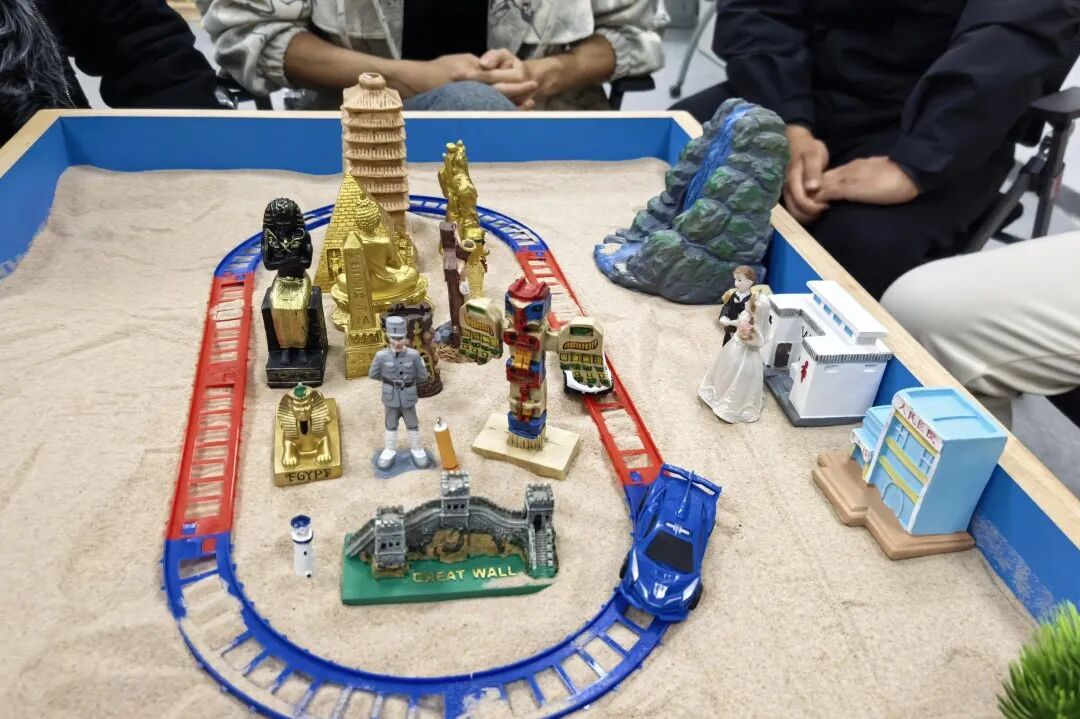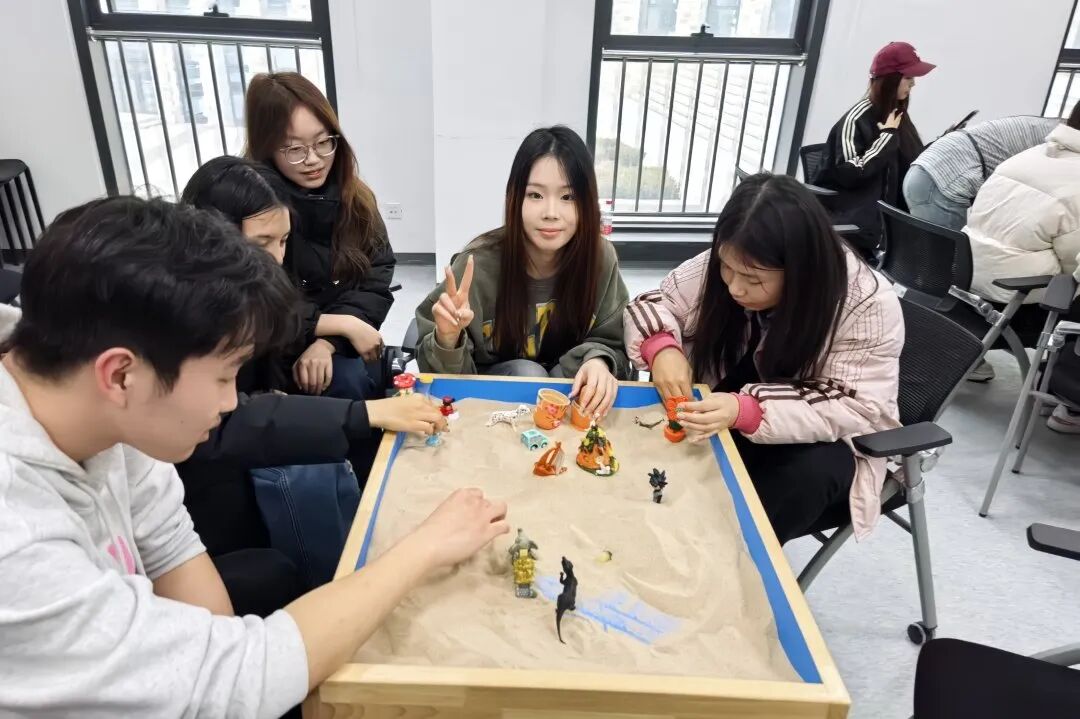 活动在轻松的热身破冰中拉开序幕,通过趣味分组与创意自我介绍,同学们迅速打破隔阂、拉近彼此距离。大家以专业术语描述当下状态,在轻松互动中完成状态觉察与团队融合。在触摸细沙唤醒感官环节,同学们在指尖触感中舒缓情绪、放松身心,为沉浸式体验奠定温暖基调。