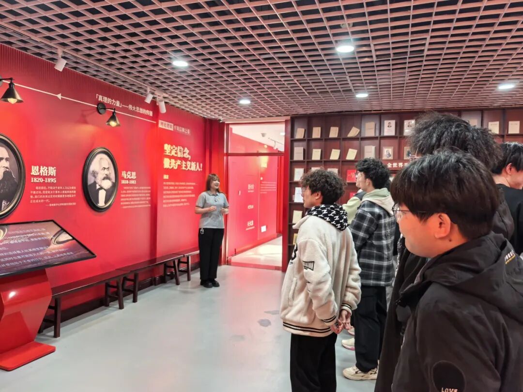 活动伊始,马克思主义学院李鑫老师带领同学们走进“坚定信念,做共产主义新人”展厅。李老师围绕《共产党宣言》展开讲解,系统回顾了马克思与恩格斯在艰苦环境中坚守理想、探求真理、撰写并传播科学理论的革命历程,帮助同学们理清理论发展的历史逻辑。随后,李老师结合展出的历史图片、文献摘录与影像资料,讲解1915年以来,陈独秀、李大钊等先进知识分子高举“民主”与“科学”大旗,冲破封建桎梏、探寻救国出路的艰辛。活动中,实验班同学们认真学习了中国共产党的百年征程,感悟中国共产党践行初心使命的奋斗史。