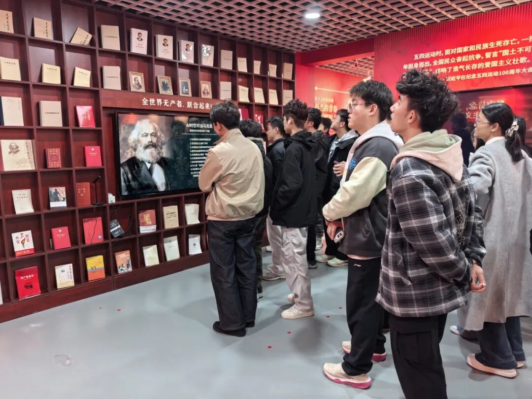 李老师带领大家来到共产党宣言墙。共产党宣言墙是由68个不同版本的《共产党宣言》构筑而成,象征着科学理论跨越时空的思想力量。结合AI虚拟成像技术,同学们可与马克思展开跨世纪对话,感受思想伟力穿越时空的震撼。