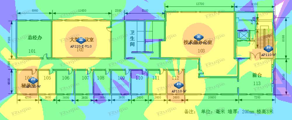 图9 无线地勘 信道冲突现象 下图是常见错误,未识别墙体,造成无线信号外溢严重, 未真实仿真 。