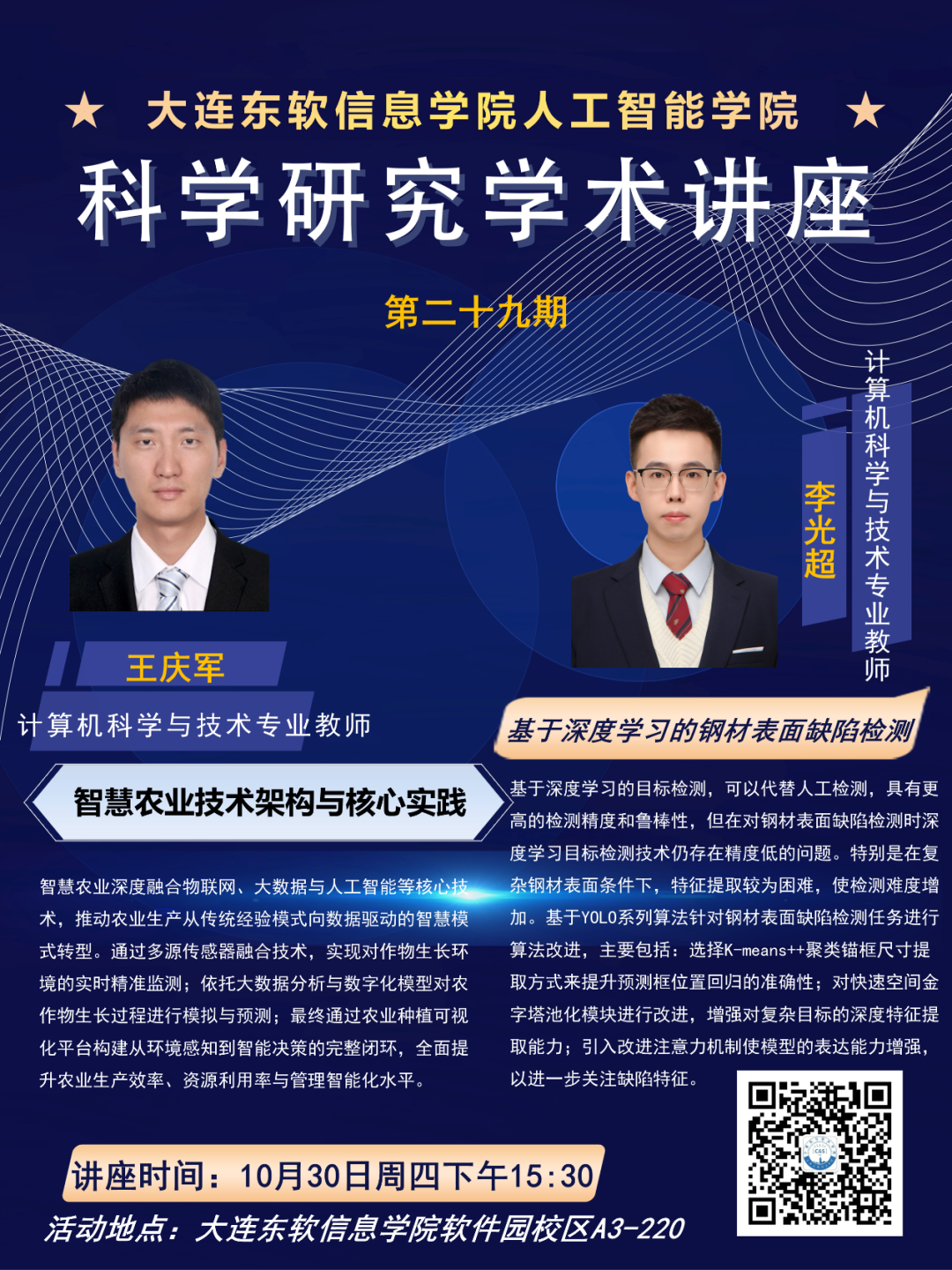 大连东软信息学院人工智能学院第二十九期科学研究学术讲座来啦,计算机科学与技术专业两位教师王庆军、李光超将带来精彩分享,内容涵盖智慧农业技术架构与核心实践、基于深度学习的钢材表面缺陷检测,为你解锁科研与应用的新路径。诚邀大家踊跃参与,共探技术创新的无限可能!
