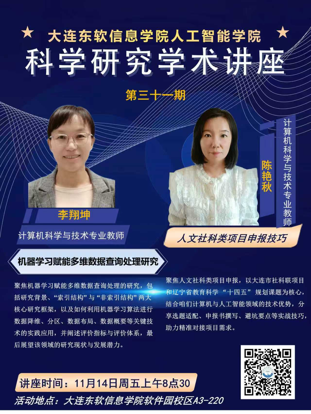 大连东软信息学院人工智能学院第三十一期科学研究学术讲座重磅来袭!计算机科学与技术专业两位资深教师李翔坤、陈艳秋将带来前沿学术分享,内容围绕机器学习赋能多维数据查询处理研究和人文社科类项目申报技巧展开,带您直击人工智能与产业融合的核心场景,探索技术落地与科研创新的双重路径。
