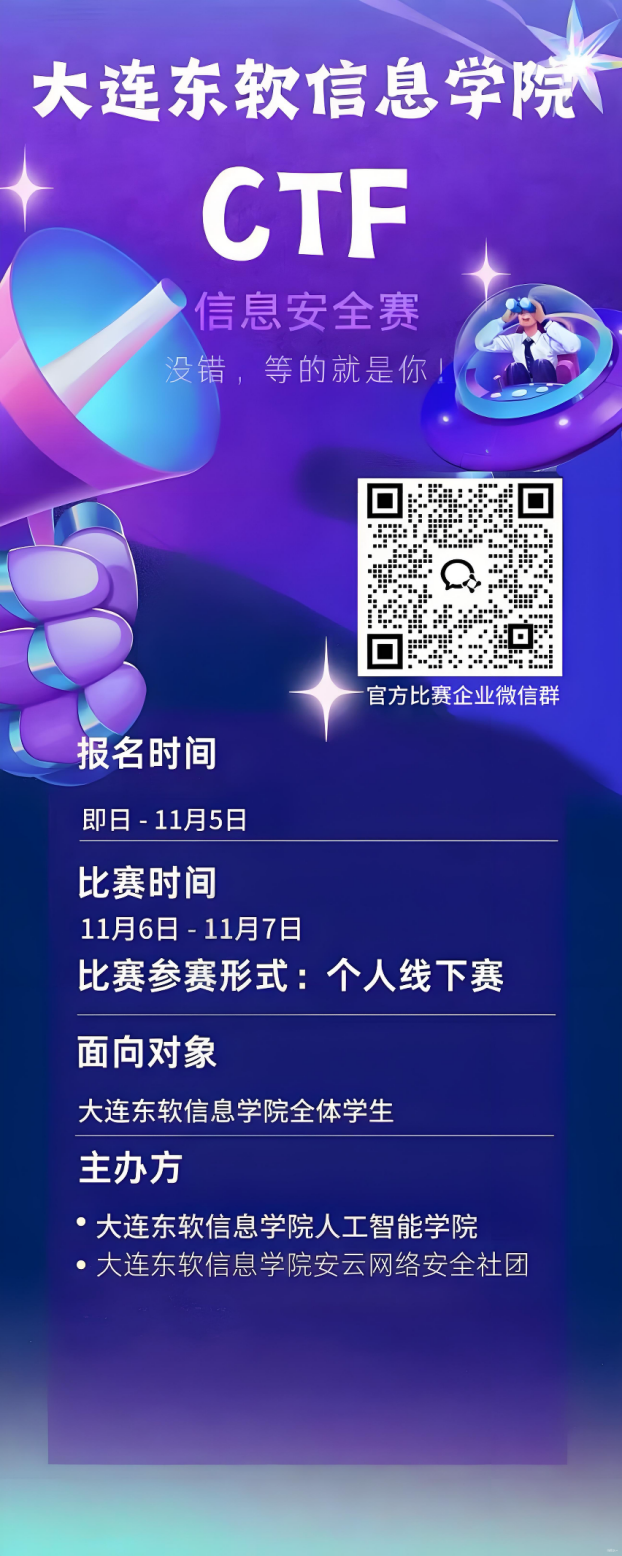 为深化产教融合,积极响应国家网络空间安全人才战略,加快构建“攻防兼备”的创新人才培养体系,实现“以赛促学、以赛促教、以赛促用”的目标,推动网络安全人才队伍建设,2025年11月6日至7日,大连东软信息学院人工智能学院与安云网络安全社团将联合开展CTF信息安全竞赛。