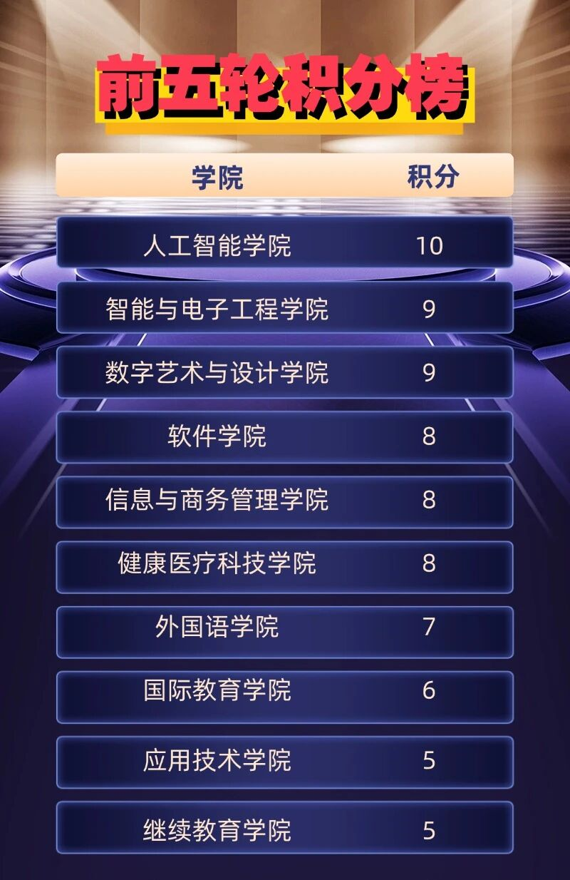 战报速递!截至目前,赛事已顺利完成五轮角逐,人工智能学院代表队凭借出色的竞技状态与团队协作,豪取五连胜,在最新积分榜上占据优势位置,势头正盛!