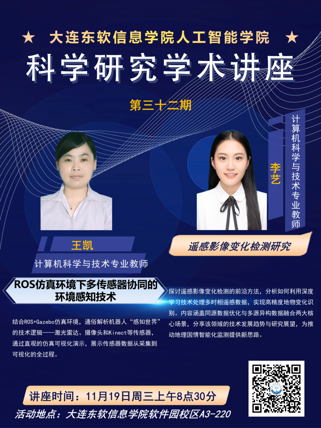 大连东软信息学院人工智能学院第三十二期科学研究学术讲座重磅来袭!计算机科学与技术专业两位资深教师王凯、李艺带来前沿学术分享,内容围绕ROS仿真环境下多传感器协同的环境感知技术和遥感影像变化检测研究展开,直击人工智能赋能产业的核心场景,解码技术落地转化与科研创新迭代的双向奔赴。