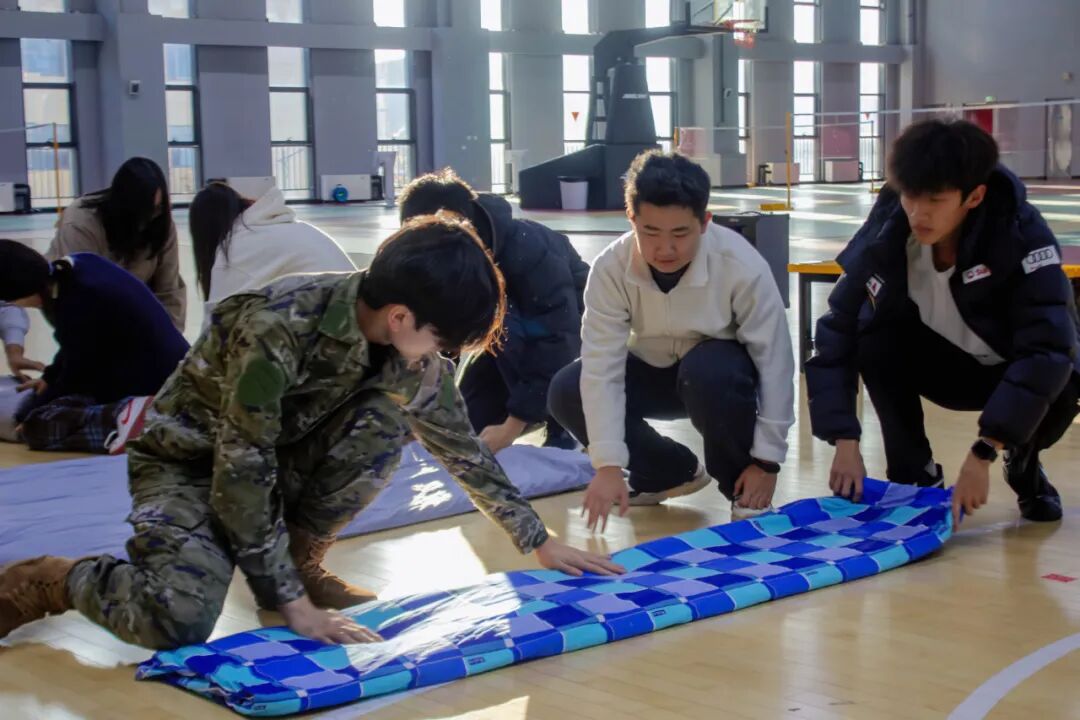 “叠被子看似是件小事,但要叠出标准的‘豆腐块’,考验的是耐心,更是对细节的极致较真。”在小天地活动现场,人工智能学院特意邀请退役大学生为同学们开展叠被子专项教学。身着迷彩服的退役大学生教官屈膝蹲下,按比例精准分出三等分、反复压实被芯,随后一步步翻折、掐棱、塑形—— 原本软塌塌的被子,在一次次细致打磨中渐渐变得方正挺括。教学过程中,现场还特别邀请活动参赛小组上台实操尝试,跟着教官的步骤亲身体验被子的叠制技巧。