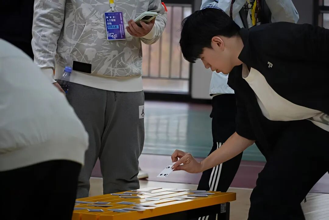 “达芬奇游戏”将顺序推理与团队接力完美融合。队员们在起点列队待命,首名队员快步冲向卡牌区,翻牌后即刻折返,凑到下一位队友耳边快速传递卡牌位置与数字。击掌的瞬间,接力队员便带着信息飞奔而出。后续队员上场前,都会与前一人高效对接信息,有的还辅以手势确认重点。有人专注记位、有人负责冲刺,每一次击掌都是信心的传递,全程充满并肩作战的热血。