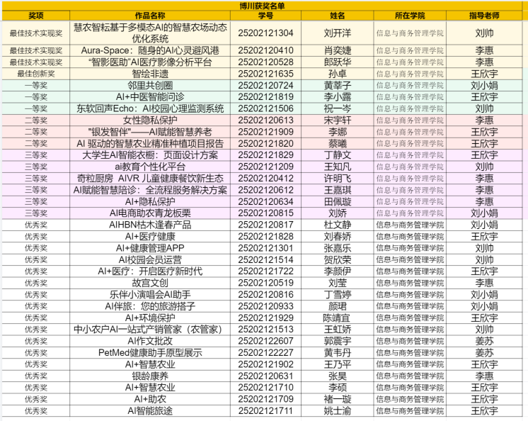 经过激烈比拼,大赛评选结果正式揭晓:两校区共评选出最佳技术实现奖6名、最佳创新奖4名、一等奖11名、二等奖14名、三等奖21名、优秀奖45名。获奖选手凭借出色的作品质量与清晰的逻辑阐述,赢得评委一致认可。