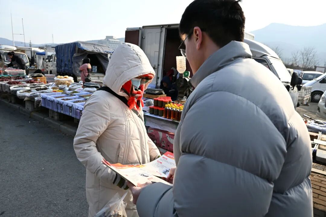 活动现场,师生党员与社区工作人员精心布置宣传点位。活动紧扣“宣传、互动、覆盖”三个环节有序展开。首环节为反诈知识宣讲会,由黄泥川社区党总支书记王贤明主持,学院教师党员代表孙胜男与社区党员代表、属地派出所民警同志相继上前,结合年关常见诈骗手法进行深入浅出的案例剖析与防范要点讲解。随后,进行反诈知识有奖竞答,吸引了众多围观群众踊跃参与,通过问答巩固宣讲知识,并发放反诈宣传册与实用宣传品,有效提升了群众的参与度与防骗意识。最后,师生党员与社区工作者分组深入集市各个摊位与人流之中,主动发放宣传单页,进行“一对一”讲解,确保反诈知识送达更多居民,织密基层安全防护网络。