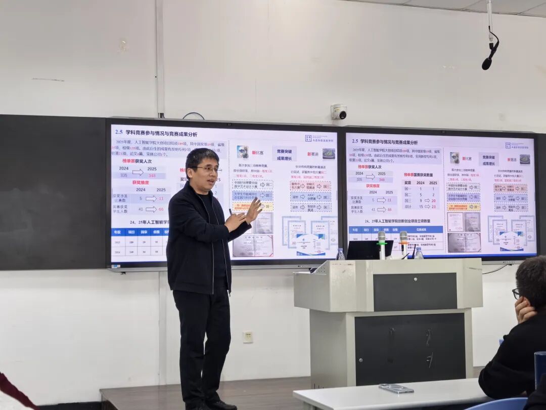 人工智能学院院长刘龙教授作《2025年工作总结暨2026年工作规划》报告。报告系统回顾了学院在党建、教学、科研、国际交流、招生就业等方面取得的显著成绩,并对2026年重点工作进行部署。刘龙院长强调,学院将继续坚持“一体化TOPCARES”教育教学改革,深化AI赋能课程建设,推进项目引领式教学,培养高素质数智化AI人才。2026年将重点完善“学分制、培养方案、项目、导师制”,构建高素质应用型人才培养先导区,持续推动学院内涵式发展。