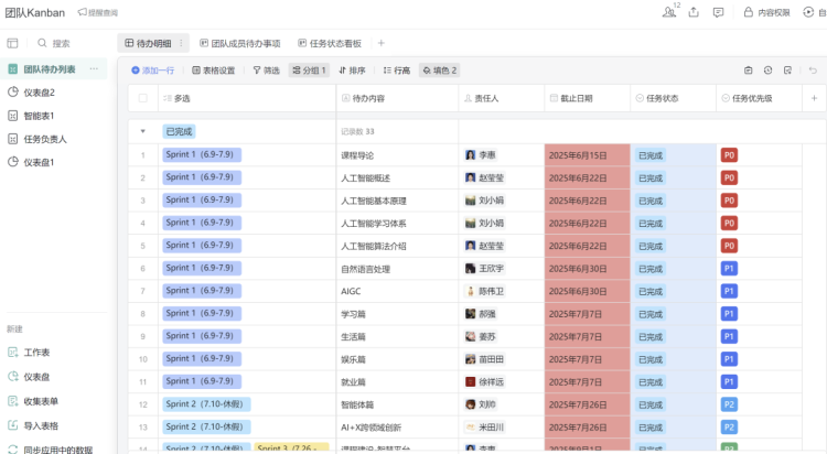 作为面向全校2025级9个专升本专业,2648名学生,开设的人工智能通识课程,课程组筹备之初便确立“技术赋能、高效协同”理念,创新采用AI工具与Scrum敏捷管理框架推进课程建设。为实现教学任务精细化管控,团队搭建看板(Kanban)系统,对知识点进行梳理、教学资源开发、课件打磨等工作全流程跟踪,确保各项任务落地见效。同时,建立每周常态化站会机制,组织教师同步工作进展、明确下周计划、破解实施难题,以高效沟通筑牢课程建设根基。