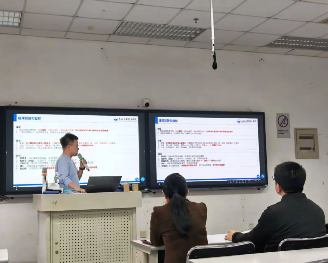 作为2024-2025学年“深耕教学优秀教师典型代表”,邢路老师深耕教学一线,在课程建设与AI技术融合方面积累了丰富的实战经验。分享会上,他结合自身主讲的《移动互联网应用开发》课程,首先剖析了课程建设的背景与核心目标,直面“教师少、学生规模大、授课周期长、学生专业基础参差不齐、新课程教学经验不足”等教学痛点,句句贴合一线教学实际,迅速引发了在场教师的强烈共鸣。