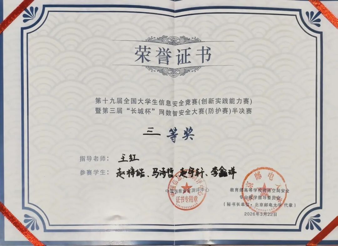 备赛期间,参赛学子深耕专业知识,反复打磨实操技能,兼顾理论夯实与实战演练,全面攻克各类安全攻防、漏洞检测、流量分析等重难点问题。此次获奖,不仅是AI学子们勤学苦练的成果见证,更彰显了学院聚焦新一代信息技术与网络安全交叉领域的育人特色,进一步激发了全院学生钻研专业技术、投身网络安全事业的热情。未来,人工智能学院将持续以赛促学、以赛促教,深耕信息安全与人工智能安全人才培养,助力培育更多高素质复合型安全技术人才。