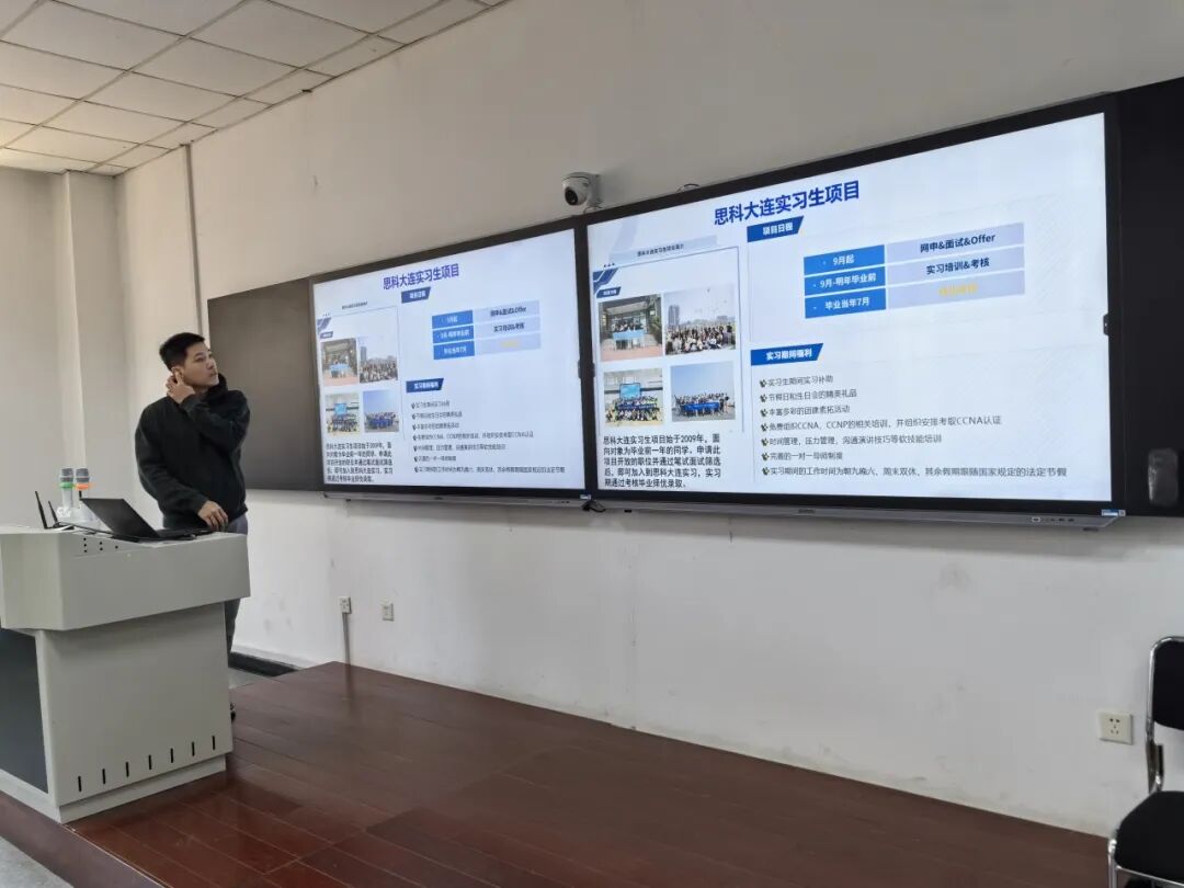 就职于大连思科的孔令宇学长,聚焦实习求职技巧展开分享。他提出,找实习要“精准布局、主动出击”,建议同学们搭建专属求职“情报网”,通过内推、行业招聘平台、企业官网多渠道获取信息。他强调,第一份实习不必执着于大厂,能接触核心技术、实现理论落地才是关键,随后,他以思科大连实习生项目为例,全面介绍了其网申流程及涵盖“岗位培训+认证支持”的培养闭环,为学弟学妹们提供了极具参考价值的职场范本。